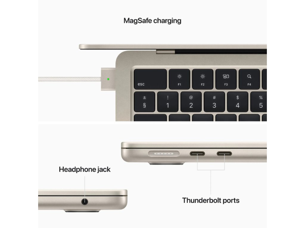 MacBook Air je navržen pro maximální mobilitu. Nízká hmotnost, tenké provedení a pasivní chlazení bez ventilátoru znamenají naprosto tichý provoz v jakékoli situaci. Elegantní barevné provedení Starlight podtrhuje prémiový vzhled zařízení.