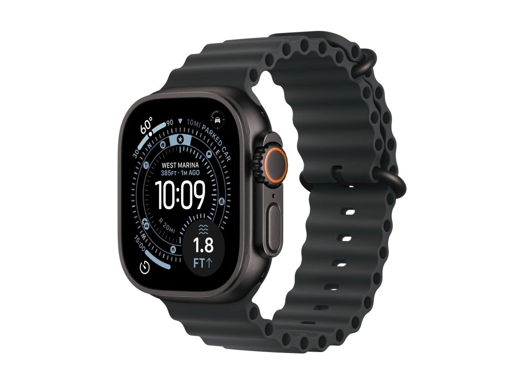 Apple Watch Ultra 3 Ocean Band černé * pro zápěstí s obvodem 130–210 mm * korunka Digital Crown s haptickou odezvou * 2x reproduktor/3x mikrofon * MIL-STD 810H Operační systém: watchOS Displej: stále zapnutý LTPO3 OLED Retina, 422×514 pixelů, 1245mm2, 326 ppi, 1/3000 nitů, obnovovací frekvence 1 Hz, noční režim Čip: * S10 s 64bitovým dvoujádrovým procesorem * 4jádrový Neural Engine * 64 GB Připojení: * dvoufrekvenční GPS L1 a L5 (GPS, GLONASS, Galileo, QZSS a BeiDou) * LTE a UMTS * Wi-Fi 4 (802.11n) * podpora 2,4GHz a 5GHz Wi-Fi sítí * Bluetooth 5.3 * NFC: Apple Pay, GymKit Snímače: * elektrický snímač srdeční činnosti * třetí generace optického snímače srdeční činnosti * saturace kyslíkem * teploty * hloubkoměr * teploty vody * kompas * stále aktivní výškoměr * akcelerometr snímající vysoké přetížení * gyroskop s vysokým dynamickým rozsahem * okolního osvětlení Voděodolnost: do 100 m (pro plavání, šnorchlování, přístrojové potápění - vyhovuje požadavkům normy EN13319 pro rekreační potápění do 40 m, a vysokorychlostní vodní sporty) Funkce: * aplikace Saturace kyslíkem * aplikace EKG * aplikace Sledování cyklu se zpětným odhadem doby ovulace * aplikace Srdeční tep * oznámení o vysoké a nízké tepové frekvenci * oznámení o nepravidelném srdečním rytmu * aplikace Léky * aplikace Všímavost se zaznamenáváním stavu mysli * aplikace Hluk * aplikace Spánek se sledováním fází spánku * spánkové skóre * upozorňování na spánkovou apnoi * oznámení o hypertenzi * tíseň SOS * mezinárodní tísňové volání * siréna * svítilna * detekce autonehody * detekce pádu * bod posledního místa s dostupností tísňového volání * monitorování hluku Kompatibilita: iPhone 11 a novější, včetně iPhonu SE (2. generace a novější) s iOS 26 nebo novějším Napájení: vestavěná dobíjecí lithium-iontová, podpora rychlonabíjení, až 42 hodin běžného používání Materiál pouzdra: titan třídy 5 Rozměry: 49x44x12mm Hmotnost: 61,8g Obsah balení: * Apple Watch Ultra 3 * řemínek * magnetická rychlonabíječka Apple Watch s USB-C kabelem (1m)Doplňkové parametry