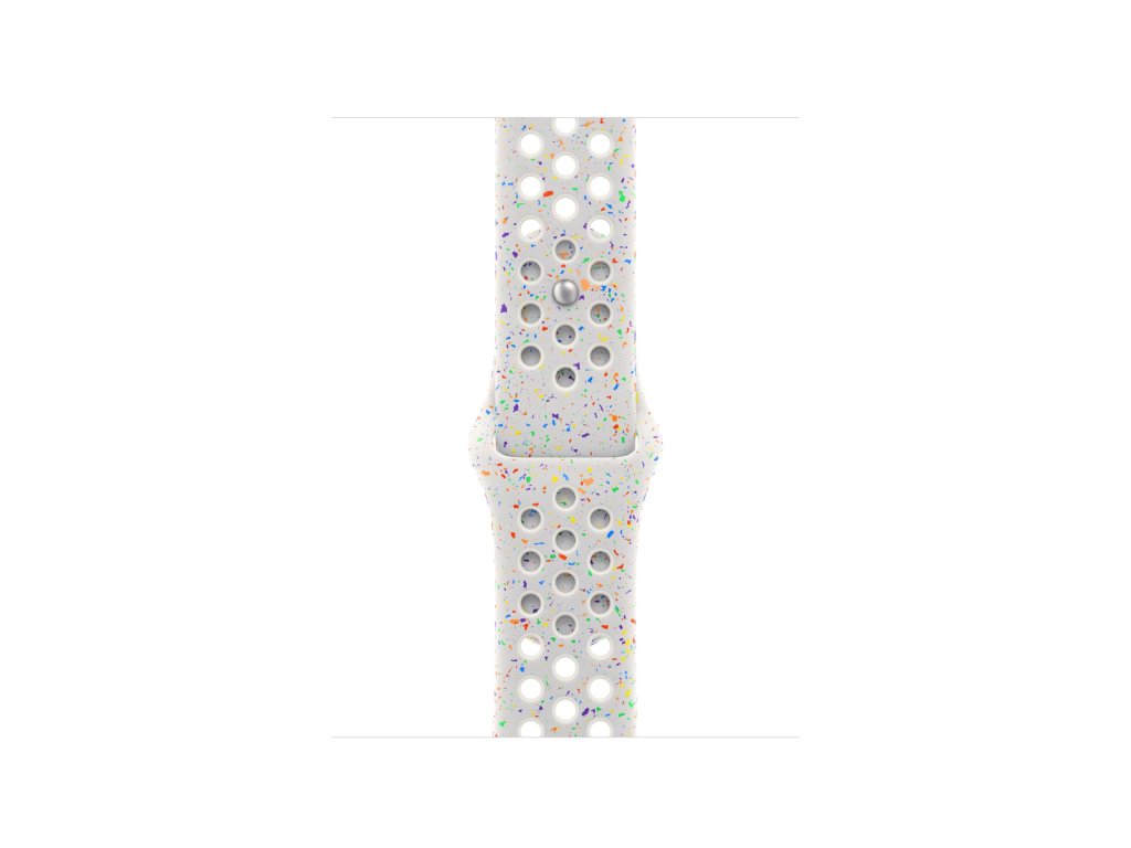 Apple 40mm sportovní řemínek Nike Tenhle sportovní řemínek Nike má vylisované otvory pro větší vzdušnost, je odolný, pevný a přitom krásně poddajný. Obsahuje barevné vločky vytvářející náhodné vzory, takže každý řemínek je originál. Jeho hladký, hutný materiál se elegantně ovine kolem zápěstí a příjemně sedí. A nově se zapíná na hliníkový kolíček s matným povrchem. Řemínek obsahuje minimálně 30 % recyklovaného fluoroelastomeru, přičemž obsah recyklovaného fluoroelastomeru v každé vločce je minimálně 66 %. V krabici Sportovní řemínek Nike k Apple Watch Technické specifikace Materiál: Fluoroelastomer Barva: platinová (Pure Platinum Nike) Velikost: S/M Kompatibilita - Modely Apple Watch * 38 mm * 40 mm * 41 mmDoplňkové parametry