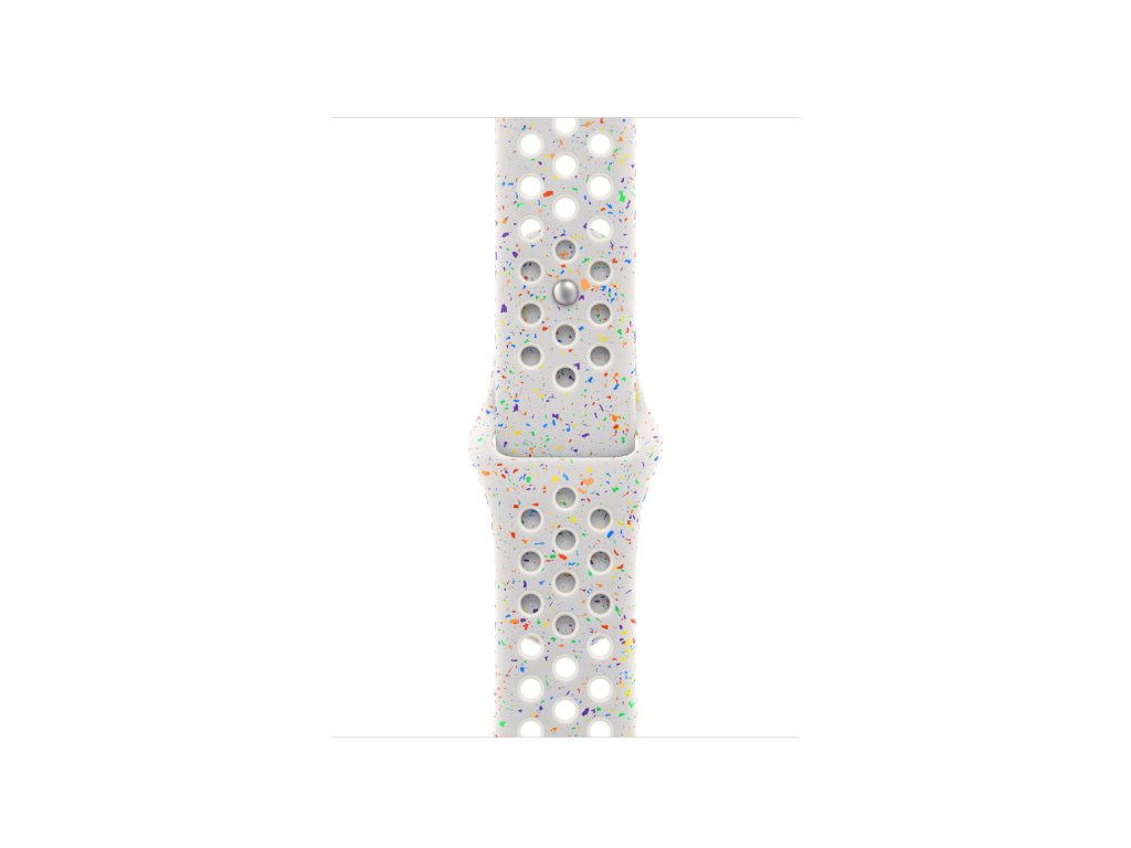 Apple 42mm sportovní řemínek Nike – S/M Tenhle sportovní řemínek Nike má vylisované otvory pro větší vzdušnost, je odolný, pevný a přitom krásně poddajný. Obsahuje barevné vločky vytvářející náhodné vzory, takže každý řemínek je originál. Jeho hladký, hutný materiál se elegantně ovine kolem zápěstí a příjemně sedí. A nově se zapíná na hliníkový kolíček s matným povrchem. Řemínek obsahuje minimálně 30 % recyklovaného fluoroelastomeru, přičemž obsah recyklovaného fluoroelastomeru v každé vločce je minimálně 66 %. V krabici Sportovní řemínek Apple Watch Nike Technické specifikace Materiál: Hliník, Minimálně 30 % recyklovaného fluoroelastomeru Barva: platinová (Pure Platinum Nike) Velikost řemínku: 130 - 180 mm Kompatibilita - Modely Apple Watch * 38 mm * 40 mm * 41 mm * 42 mmDoplňkové parametry