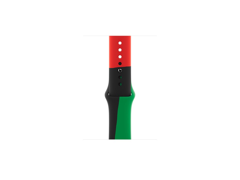 44mm sportovní řemínek Black Unity – M/L Sportovní řemínek Black Unity, navržený černošskými kreativci a jejich kolegy v Apple na oslavu a uznání černošské historie a kultury, je inspirovaný barvami panafrické vlajky a vzdává hold bohaté tradici řemeslné výroby prošívaných dek. Sestavuje se ručně ze tří samostatných kusů barevného fluoroelastomeru, které se tlakově lisují do jednoho celku. Doplňuje ho dynamický ciferník Unity, na kterém se neustále proměňují nepravidelné tvary podle toho, jak se Apple Watch pohybují. Barvy na displeji tak utvářejí jedinečnou tapisérii. Na inovativním kolíčkovém zapínání jsou laserově vygravírovaná hesla „Truth. Power. Solidarity.“ (Pravda. Síla. Solidarita.)Doplňkové parametry