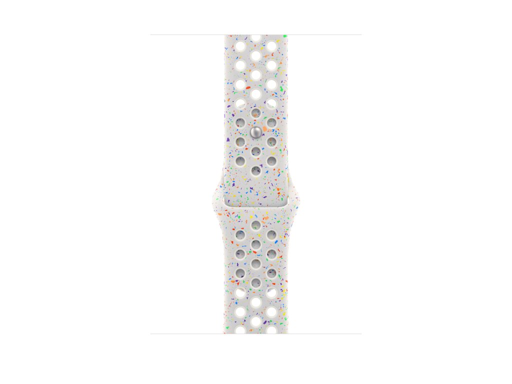 Apple 46mm sportovní řemínek Nike – M/L Tenhle sportovní řemínek Nike má vylisované otvory pro větší vzdušnost, je odolný, pevný a přitom krásně poddajný. Obsahuje barevné vločky vytvářející náhodné vzory, takže každý řemínek je originál. Jeho hladký, hutný materiál se elegantně ovine kolem zápěstí a příjemně sedí. A nově se zapíná na hliníkový kolíček s matným povrchem. Řemínek obsahuje minimálně 30 % recyklovaného fluoroelastomeru, přičemž obsah recyklovaného fluoroelastomeru v každé vločce je minimálně 66 %. V krabici Sportovní řemínek Apple Watch Nike Technické specifikace Materiál: Hliník, Minimálně 30 % recyklovaného fluoroelastomeru Barva: platinová (Pure Platinum Nike) Velikost řemínku: 160 - 210 mm Kompatibilita - Modely Apple Watch * 44 mm * 45 mm * 46 mm * 49 mmDoplňkové parametry